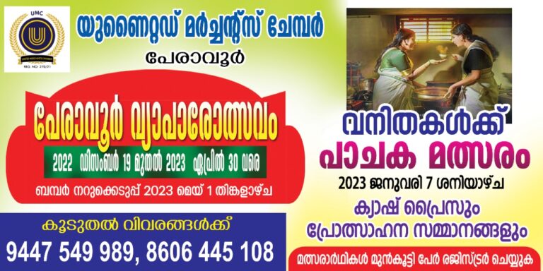 പേരാവൂർ: യുണൈറ്റഡ് മർച്ചന്റ്സ് ചേംബർ പേരാവൂർ യൂണിറ്റ് നടത്തുന്ന പേരാവൂർ വ്യാപാരോത്സവത്തിന്റെ ഭാഗമായി സ്ത്രീകൾക്കായി പാചക മത്സരം സംഘടിപ്പിക്കുന്നു. ജനുവരി ഏഴ് ശനിയാഴ്ച നടക്കുന്ന പ്രതിവാര സമ്മാനകൂപ്പൺ...