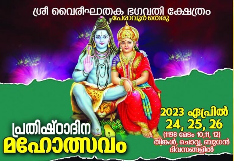 പേരാവൂർ: തെരു വൈരീഘാതക ഭഗവതി ക്ഷേത്രത്തിൽ പ്രതിഷ്ഠാദിന ഉത്സവം ഏപ്രിൽ 24,25,26 (തിങ്കൾ,ചൊവ്വ,ബുധൻ) തീയതികളിൽ നടക്കും. തിങ്കളാഴ്ച രാവിലെ ആറിന് ഗണപതിഹവനം,വൈകിട്ട് ആറിന് കലവറനിറക്കൽ ഘോഷയാത്ര,ഒൻപത് മണി...