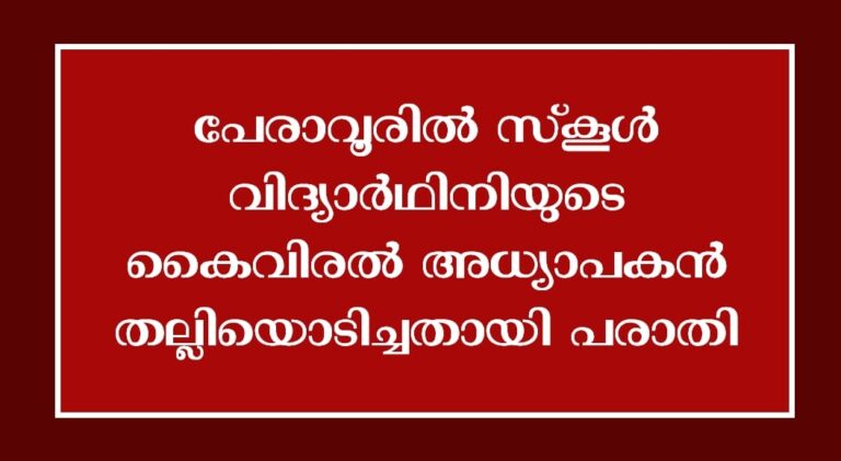 പേരാവൂർ: സ്കൂൾ വിദ്യാർഥിനിയുടെ കൈവിരൽ അധ്യാപകൻ തല്ലിയൊടിച്ചതായി പരാതി. പേരാവൂർ ബ്ലോക്ക് പരിധിയിലെ മാനേജ്മെന്റ് സ്കൂൾ അധ്യാപകനെതിരെ ഇത് സംബന്ധിച്ച് ചൈൽഡ് ലൈനിൽ പരാതി നല്കി. പേരാവൂർ...
