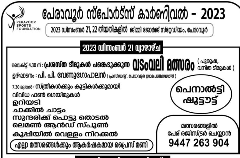 പേരാവൂർ : പേരാവൂർ സ്പോർട്സ് ഫൗണ്ടേഷൻ സംഘടിപ്പിക്കുന്ന ഗുഡ് എർത്ത്പേരാവൂർ മാരത്തണിന്റെ ഭാഗമായുള്ള സ്പോർട്സ് കാർണിവൽ വ്യാഴം, വെള്ളി ദിവസങ്ങളിൽ നടക്കും. ഡിസംബർ 21 വ്യാഴാഴ്ച വെകിട്ട്...