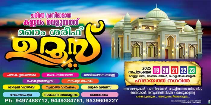 കൂത്തുപറമ്പ്: കണ്ണവം മഹല്ല് മുസ്ലിം ജമാഅത്ത് അൻവാറുൽ ഇസ്ലാം പള്ളി മദ്റസ കമ്മിറ്റിയുടെ ആഭിമുഖ്യത്തിൽ നടത്തിവരുന്ന കണ്ണവം വെളുമ്പത്ത് മഖാം ഉറൂസ് ഈ മാസം 19, 20,...
