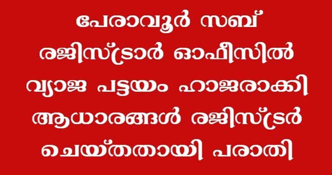 പേരാവൂർ സബ് രജിസ്ട്രാർ ഓഫീസിൽ വ്യാജ പട്ടയം ഹാജരാക്കി ആധാരങ്ങൾ രജിസ്ട്രർ ചെയ്തതായി പരാതി