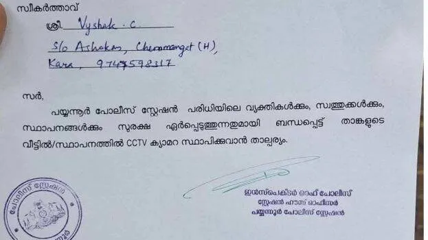 സ്വന്തം സുരക്ഷ സ്വയം ഏർപ്പെടുത്തണം; സി.സി ടിവി സ്ഥാപിക്കാൻ പൊലീസ് കത്ത്